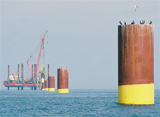 The typical construction process for a wind turbine subsea monopile foundation in sand includes driving a large hollow steel pile, of some 4 m in diameter with approximately 50mm thick walls, some 25 m deep into the seabed, through a 0.5 m layer of larger stone and gravel to minimize erosion around the pile. A transition piece (complete with pre-installed features such as boat-landing arrangement, cathodic protection, cable ducts for submarine cables, turbine tower flange, etc.) is attached to the driven pile, and the sand and water are removed from the centre of the pile and replaced with concrete. An additional layer of an even larger stone, up to 0.5 m diameters, is applied to the surface of the seabed for longer-term erosion protection.