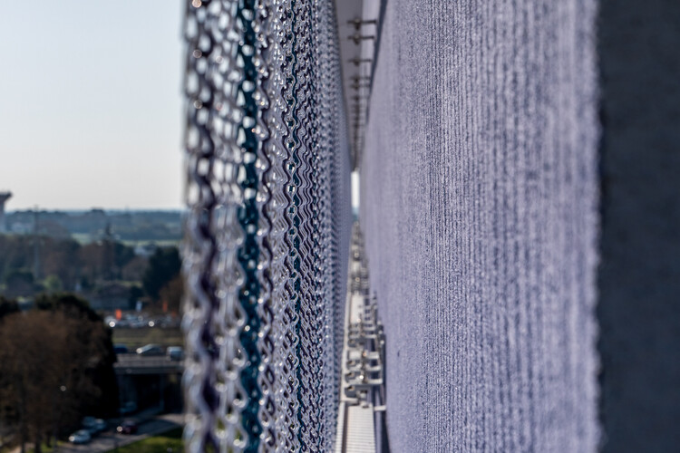 Aluminium chain links increase the thermal climate within the building, minimising heat transfer from direct sunshine and enabling airflow in addition to enhancing the façade’s appearance. Its sturdy outward appearance offers solitude. Inside, complete visibility is made possible by the connections’ transparency, creating striking shadows that enhance and compliment the building’s interior.