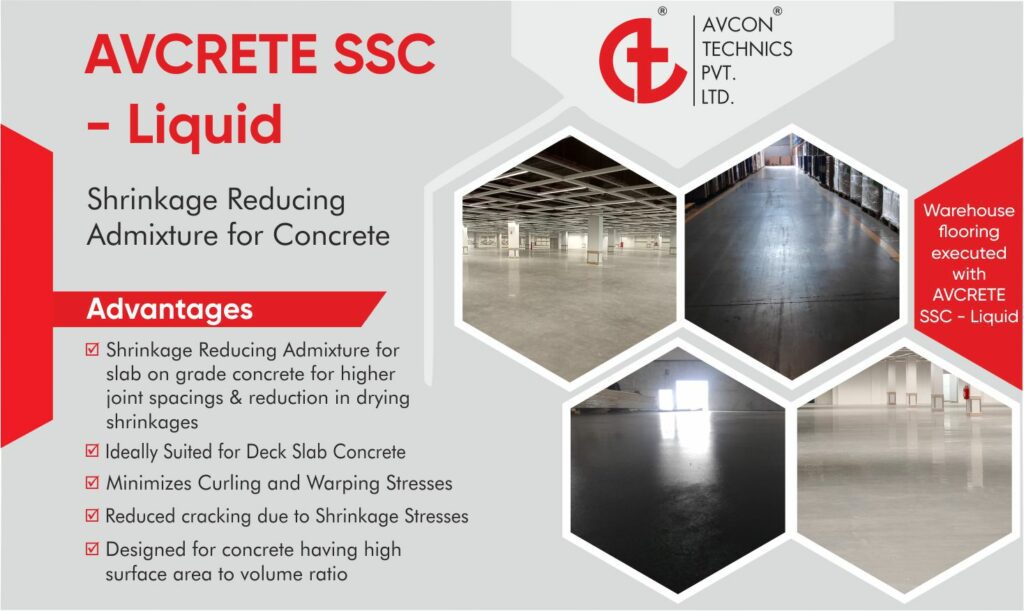 Shrinkage Reducing- Avcrete SSC is one of Avconās performance products. The product is used for slab-on-grade concrete for higher joint spacings and reduction in drying shrinkages. Designed for concrete having a high surface area to volume ratio.