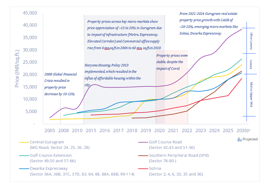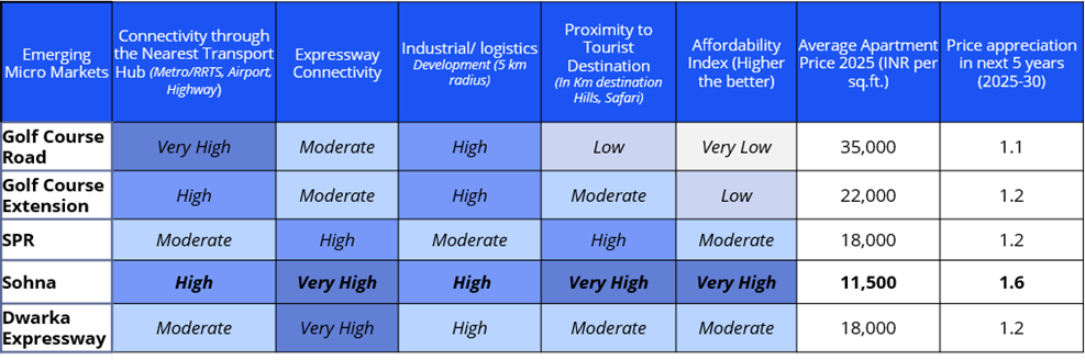 Within the National Capital Region (NCR), urbanization has been most pronounced in satellite cities such as Delhi, Gurugram, Noida, Faridabad and Ghaziabad. Among these, Gurugram has emerged as a leading hub, driven by strong in-migration of professionals and entrepreneurs, large-scale infrastructure upgrades, and luxury residential development. Its transformation began with the establishment of Maruti Suzuki in 1982, gained momentum with the first Gurugram Master Plan 2031 released in 2007, further accelerated by IT/Business Parks, Yellow line Metro expansion, Expressway connectivity and industrial development. With land availability in central Gurugram becoming saturated and commercial hubs such as Cyber City, Golf Course Road, Dwarka Expressway reaching maturity with respect to land area and price, the city’s urban footprint has steadily moved towards South of Gurugram. Which has led to the rise of new micro-markets that are witnessing growing demand real estate activity.