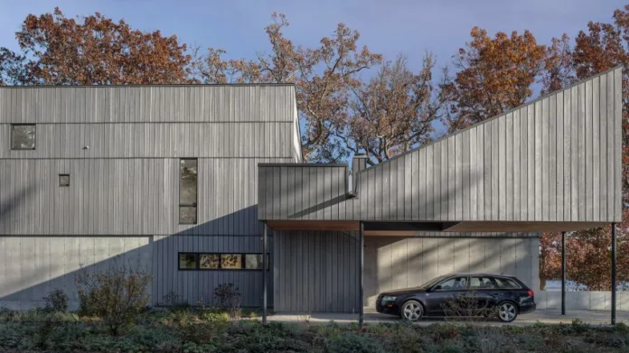 Wood is a prominent feature in both the exterior and interior. The wooden interiors include three bedrooms upstairs, with one situated in a volume that cantilevers 15 feet over a terrace below. A carport running alongside the house features a large roof “attic” providing storage space for sports and gardening equipment. The carport’s gravel surface allows rainwater to soak into the soil.
