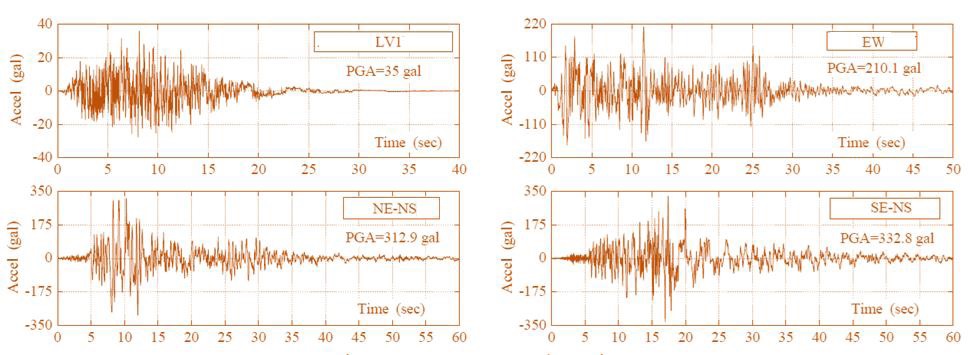 Nonlinear dynamic analysis can show all kinds of responses of structure under fortifiable (LV2) and severe (LV3) earthquake by inputting ground motions at the fixing point. Besides the aforementioned three natural records, here are the other two artificial records shown in Fig.6. The peak ground acceleration corresponding LV2 and LV3 are 100gal and 220gal respectively. When calculating, Newmarkās numerical integration method is utilized, and the time interval is set to be 0.005 second. The viscous damping matrix is assumed to be Rayleighās damping, and the modal damping ratio is 4%.