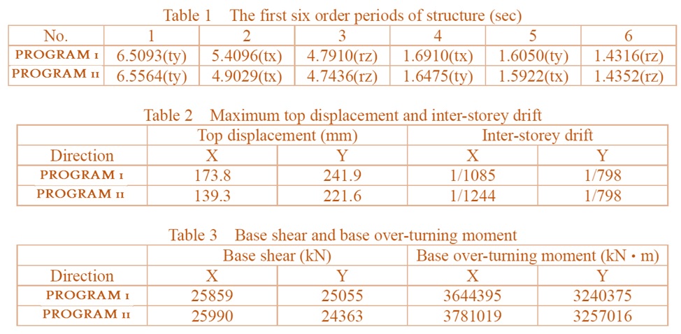 All these data indicate that the results of two programs are quite close, except that the X-directional stiffness of structure calculated by two programs has relatively differences. The writers consider that the differences are caused by different wall models of two programs. Generally speaking, this comparison validates the correctness of the analytical model. And for simplicity, the following comparisons are only related to the results of others.