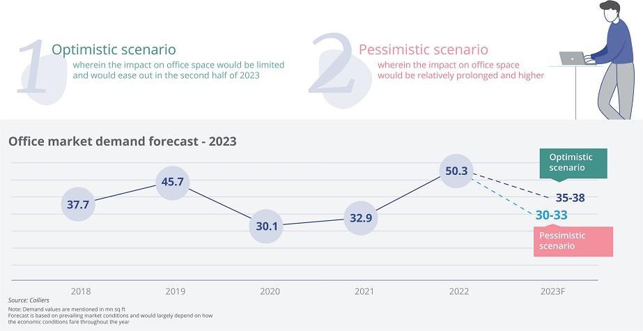 In a pessimistic scenario, we expect the impact of economic headwinds would be prolonged, leading to slackening in leasing activity and postponement of leasing decisions by occupiers, as they hold on expansionary strategies. In such a case, we expect office leasing to hover around 30-33 mn sq ft. We however expect leasing activity to pick up from mid-year, led by Global capability centers, BFSI companies and start-ups with sound business models.