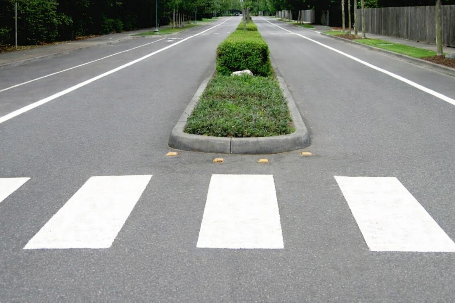 Level with the road surface and differentiated by pavement markings or reflective studs. It is suitable where space constraints do not allow raised or depressed medians.