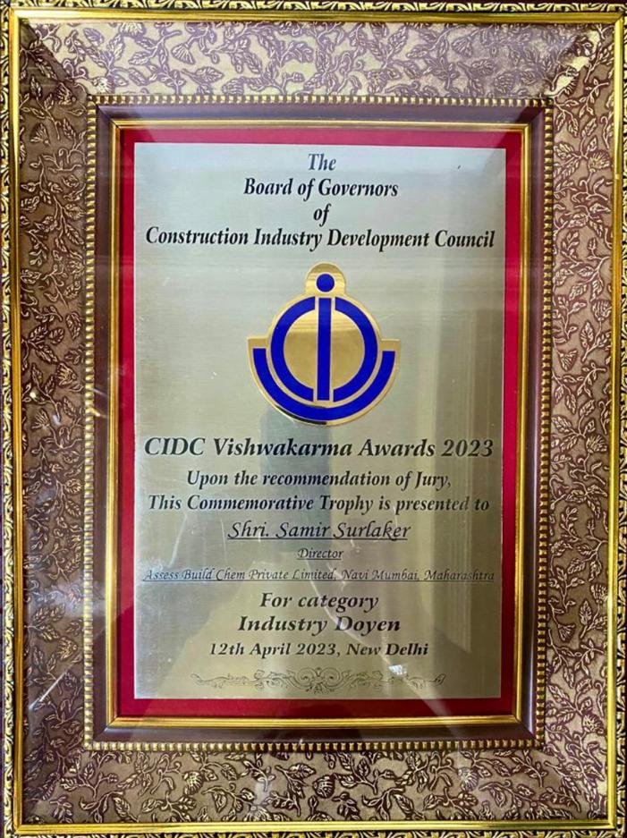 The 14th CIDC Vishwakarma Awards were presented during the India Construction Meet in New Delhi on April 12th, 2023, in a glittering function attended by over 500 professionals. During this event, Er. Samir Surlaker, was conferred the prestigious CIDC Vishwakarma Award in the Category of Industry Doyen, as recognition of his 45 years of service in Construction Chemicals (CC) Industry.