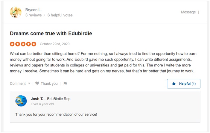 After reading many reviews for Edubirdie online, we already had set good expectations for the company. They didnāt disappoint us either ā the essay we got here was of high quality, free of plagiarism, came on schedule, and met all the requirements we set in our order.