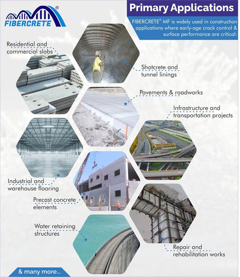 FIBERCRETE-MF provides a reliable, engineered solution that enhances crack control, surface durability, and early-age performance. By improving cohesion, reducing shrinkage cracking, and ensuring uniform fiber distribution, it enables the construction of more durable, stable, and high-quality concrete structures aligned with modern infrastructure requirements.