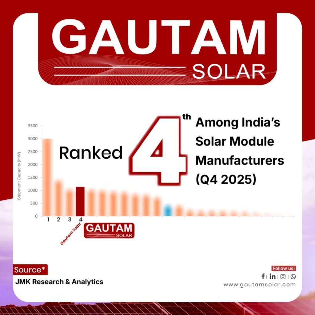 Gautam Solar, India’s fastest-growing solar module manufacturer, has secured 4th position in the recent report by JMK Research & Analytics for Q4 2025. The report highlights the competitive performance of prominent players in India’s solar module market.