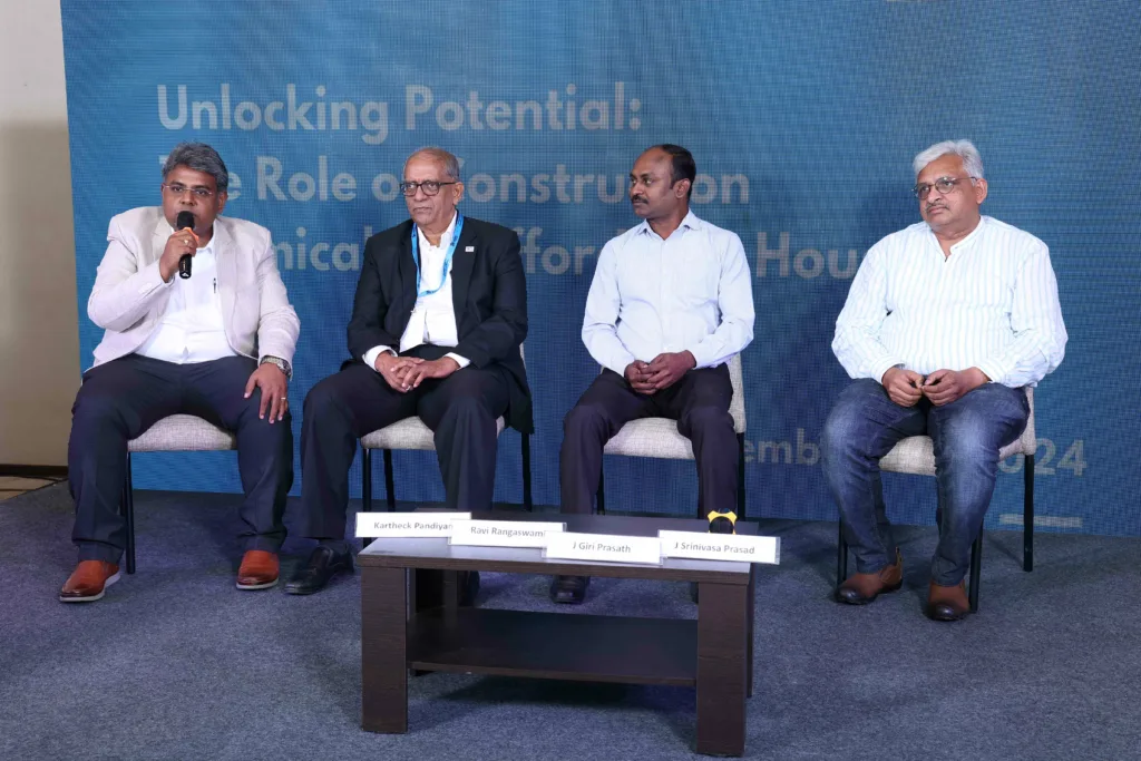 The workshop also included panel discussions, moderated by Mr. Varun Pujari and Mr. Kartheck Pandiyan, featuring industry leaders such as Mr. Pushparajan (PUPA Chemicals), Mr. J Srinivas Prasad (La Greens India Pvt. Ltd.), and Mr. Ravi Rangaswami (Waterproofers Association of India). These discussions highlighted the importance of collaboration in using construction chemicals for climate adaptation and durability in affordable housing. The workshop ended with a vote of thanks from Mr. Prasanna Sriraman, emphasizing the joint efforts of all participants in advancing affordable and resilient housing solutions.