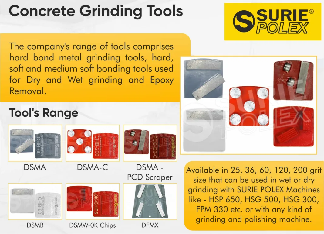 For hard concrete surfaces, a soft bond is recommended. This type of bond ensures that the diamond segments remain sharp and are less prone to wear. Conversely, when dealing with medium-soft concrete, a hard bond is more suitable. Choosing the right grinding and polishing tools for the specific requirements of the project is important. Surie Polex is one of the leading manufacturers of a range of grinding tools. i.e. hard bond, medium bond, and soft bond to name some.