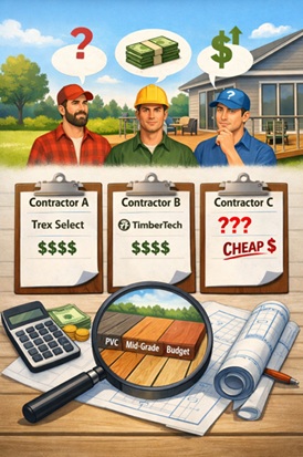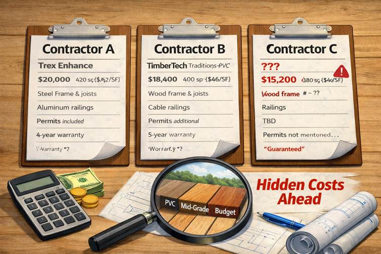 A couple of things to keep in mind when you build this table. First, normalize by square footage. Divide the total price by the quoted square footage to get a true per-sq-ft number. It is the only honest way to compare. Second, if contractors quoted different composite tiers, ask all three to re-quote using the same product. For example, ask everyone to price Trex Select. Then the comparison is actually apples to apples.