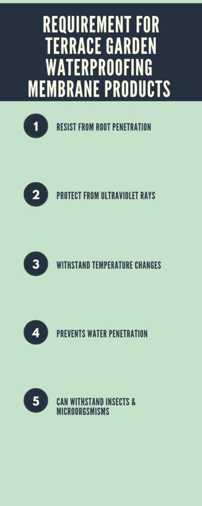 The selection of the right waterproofing product is the key for the long-term life cycle of the terrace garden. The product must have the following features.