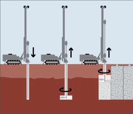 Jet grouting uses a high-pressure ājetā of either grout, water, air or a combination to erode soil whilst simultaneously injecting grout into the soil through a ājet monitorā. The specially designed drill stem and monitor are raised and rotated at the same time to combine the grout with the original soil to form āsoilcreteā. The end product is cemented round columns and is basically effective in any soil but not necessarily efļ¬cient in every soil.