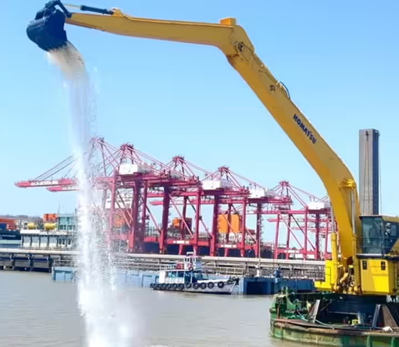 The backhoe dredger is equipped with a 1,000 BHP engine that provides exceptional hydraulic performance, while its various boom and arm configurations allow for dredging depths ranging from 4 meters to 30 meters below the water surface. Its bucket capacity varies from 1.75 cubic meters to 12 cubic meters, depending on the configuration, and it boasts high cycle efficiency for quicker and more accurate dredging operations.