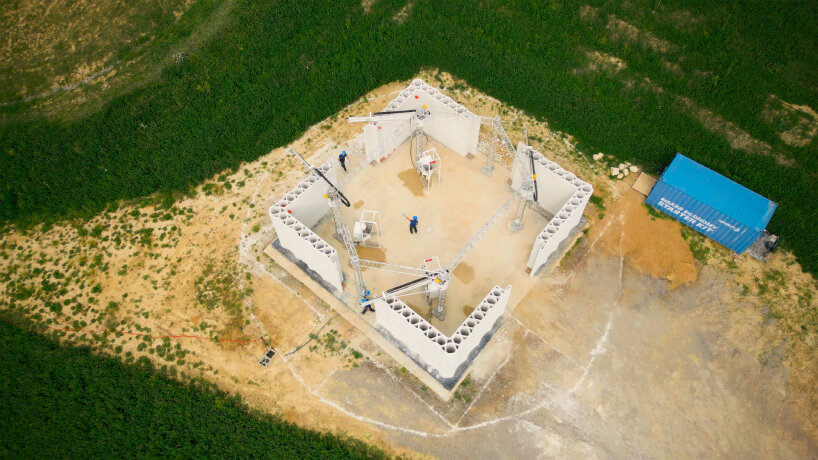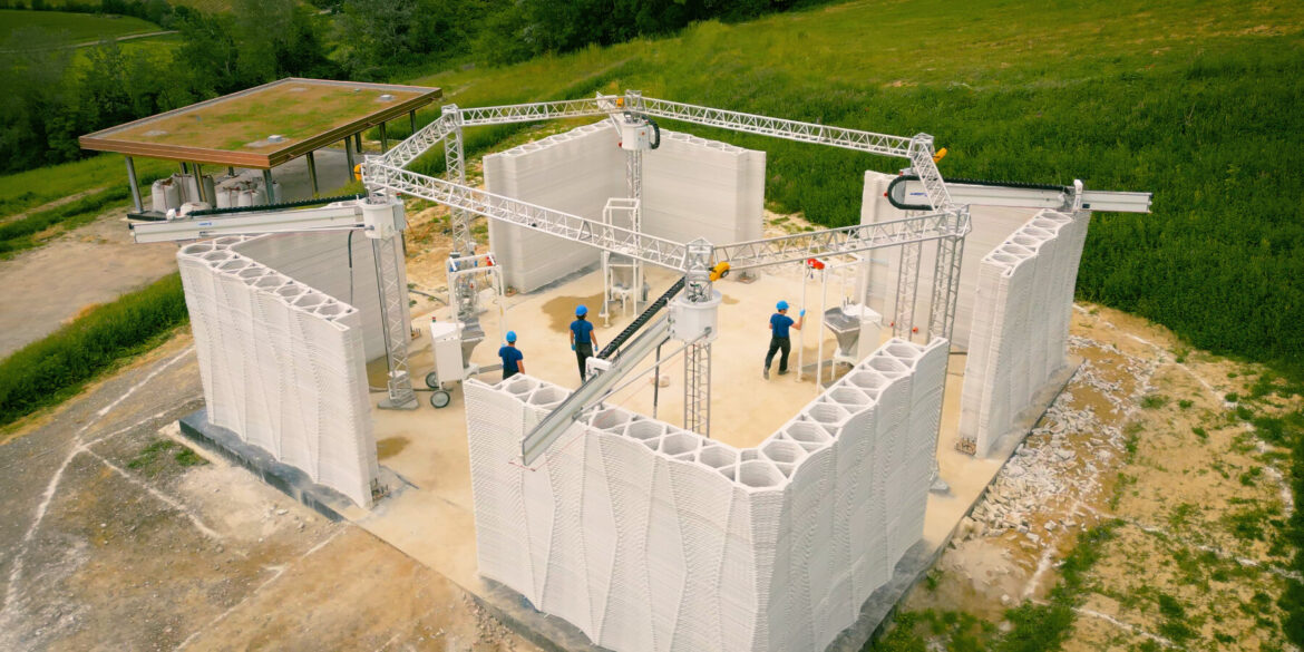 The construction process relies on four robotic arms positioned at the vertices of a hexagonal structure. These robotic systems simultaneously printed the walls using WASP’s Crane WASP technology, demonstrating how large-scale additive manufacturing can be applied efficiently in architectural projects.