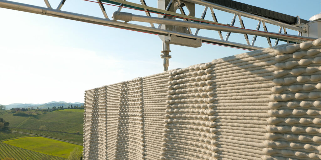 One of Itaca’s defining features is its use of lime-based materials, completely avoiding concrete to significantly reduce carbon emissions. The walls are printed with a mixture that allows the building envelope to naturally regulate temperature, improving thermal comfort without relying heavily on mechanical systems.
