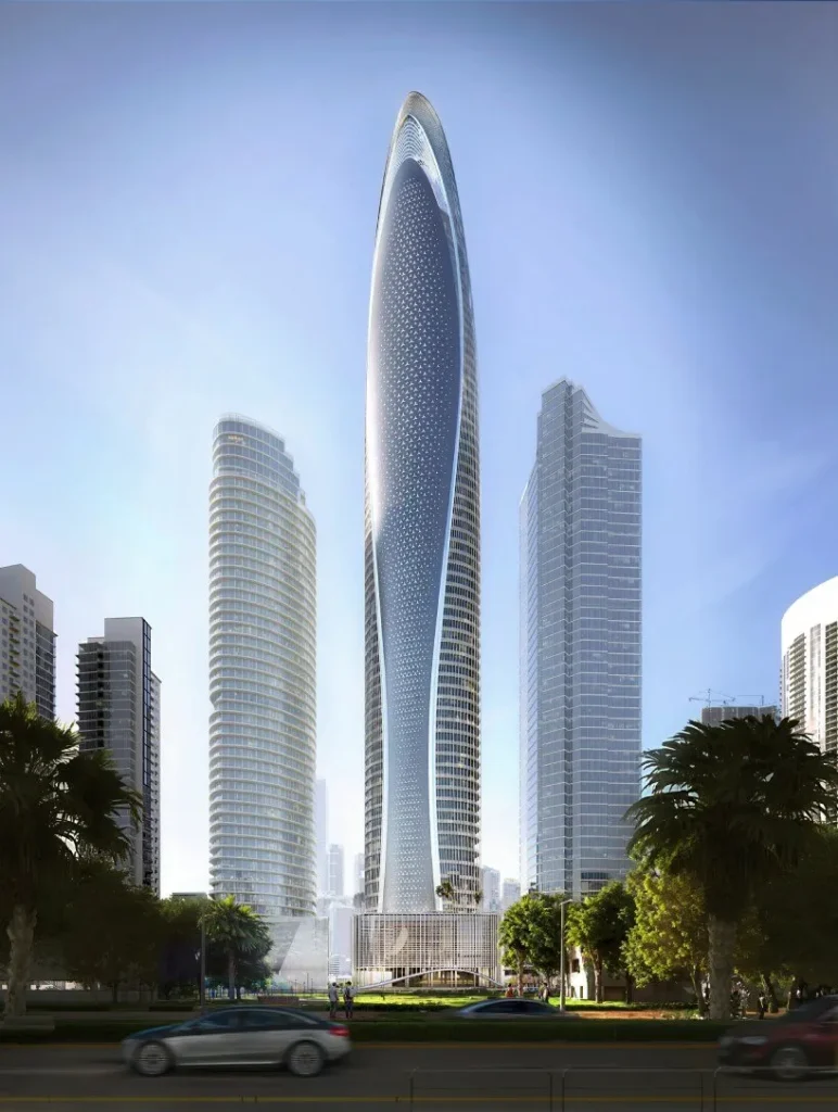 Binghatti, in partnership with Mercedes-Benz, is developing a 65-storey residential tower in Dubai. Located on Sheikh Zayed Road, this high-rise project marks the German automaker’s first entry into the built environment. The tower prioritizes engineering logic, internal flow, and integrated systems over decorative branding. Rising to 341 meters, it will offer around 150 housing units. Apartment sizes vary from two-bedroom layouts to four-bedroom penthouses. Completion is expected in 2026, with construction already underway.