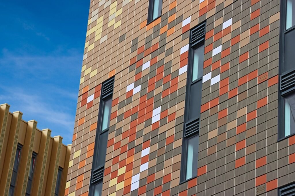 • Cladding Panels: The visible exterior surface, made from materials like high-pressure laminates (HPL), fibre cement boards, metal composites, ceramics, terracotta, or GRC (Glassfibre Reinforced Concrete).
