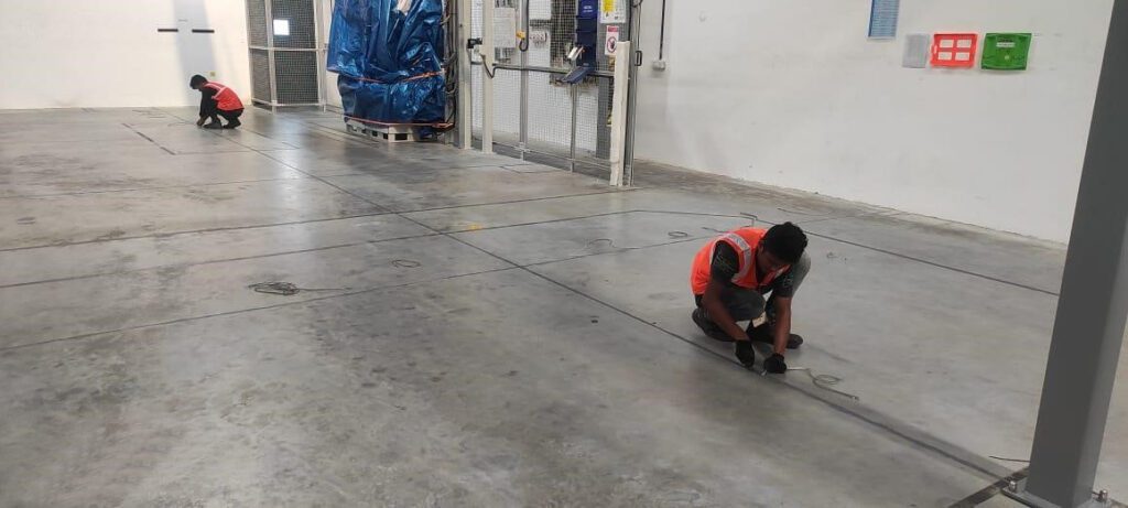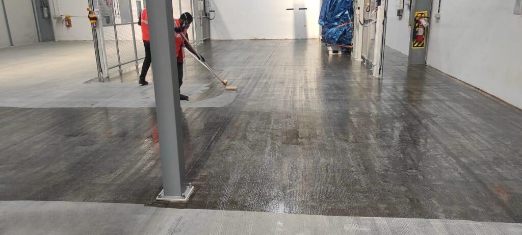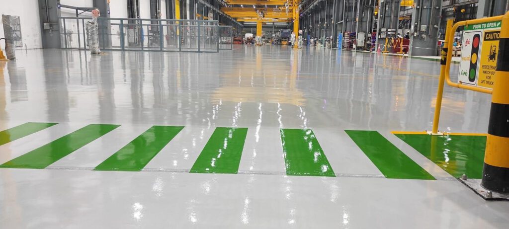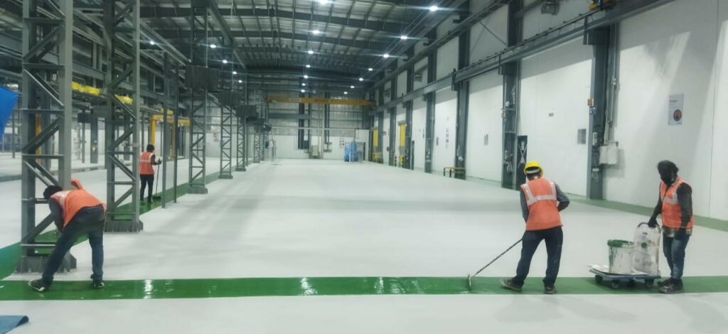 - After completing yellow line marking as per customer’s requirements, one coat of silicone-epoxy hybrid sealer is applied to obtain stain & oil resistant floor.