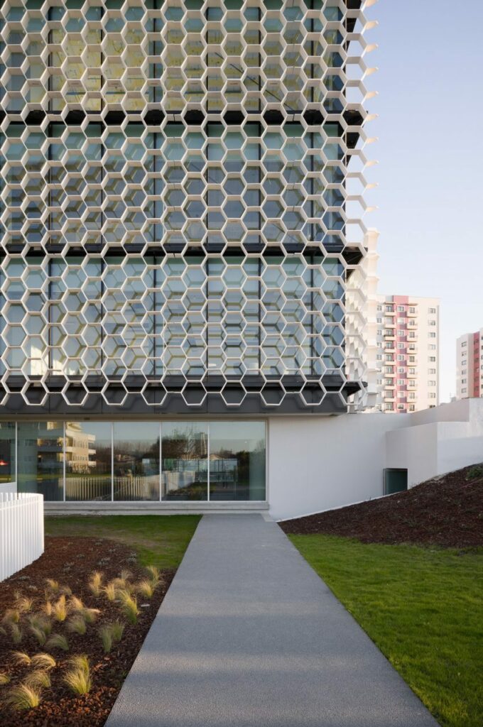 The architects noted, āThe building sits in a fragmented part of Porto, where the urban fabric is discontinuous. The proposal responds by establishing new relationships between built form and landscape.ā