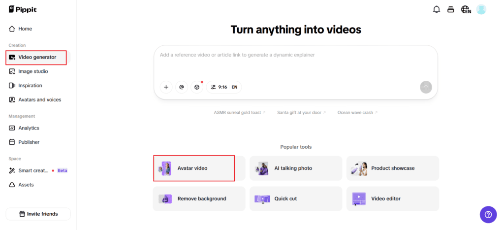 Go back to Pippit and navigate to Video generator from the left-side menu. Then pick the Avatar Video tool from the Popular tools area. This way you can select or create AI-powered avatars for your videos effortlessly, syncing voiceovers with avatars in just a few clicks.