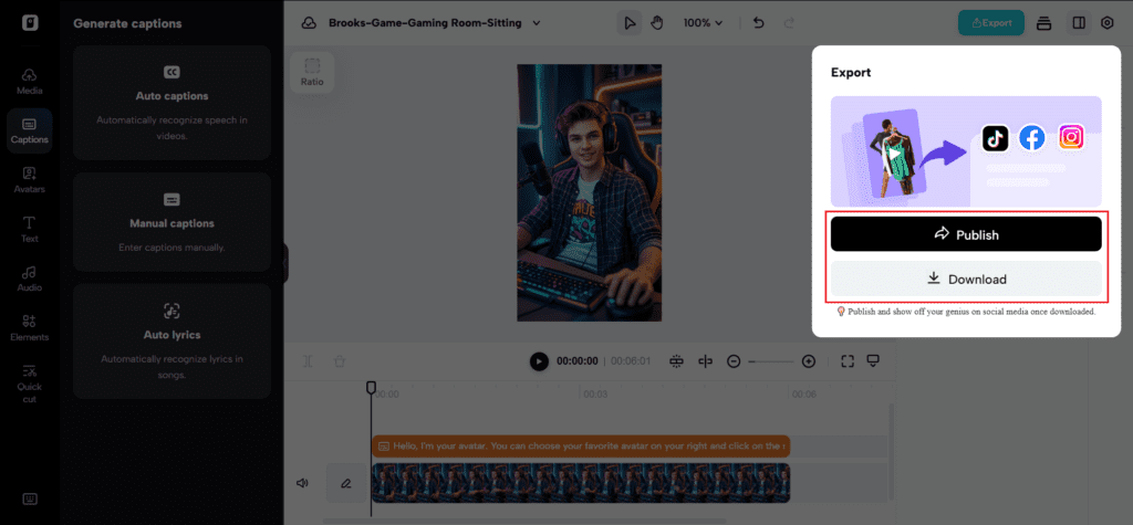 After lip-syncing your character, go to Edit more to make your video even better. Time things out, improve the expressions, and add in overlays and background music to make the end result even better. When you’re done, hit the export button to get your video. Or use the Publisher tool to share it on social media such as TikTok, Instagram, and Facebook.