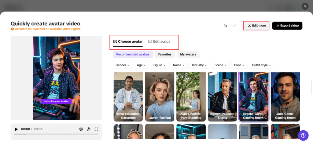 Having accessed the avatar section, now you should choose your avatar from the Recommended avatars section. Avatars can be filtered by various criteria such as gender, age, industry and so forth to suit your tech brand better. Then, all you need to do is click the Edit script button to personalize your dialogue. Type your text and let your avatar do the talking – literally.