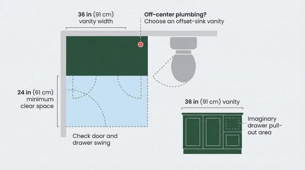 Measure first, buy once. Tape out a 36-inch (91 cm) footprint on the wall, open an imaginary drawer, and make sure doors clear baseboards and the toilet. Leave at least 24 inches (61 cm) of clearance in front so you can bend comfortably at the sink. If plumbing sits off-center, select an offset-sink cabinet such as Willow Orlando or plan for a quick reroute.