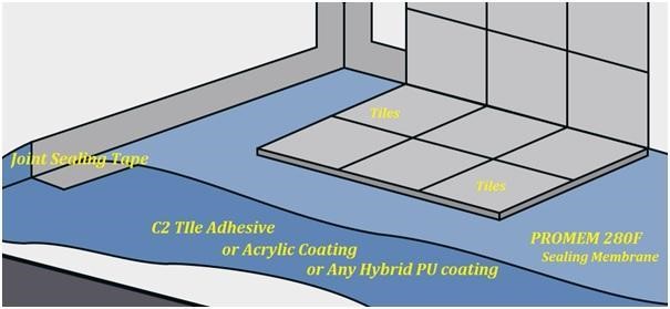 Apply the PROMEM waterproof sealing membrane in wet areas like Balconies, Sunken Portion, Kitchen, Bathroom, and Terrace, Swimming pool in domestic or commercial structures on the wall or floor from top to the bottom and from the center to the edges.