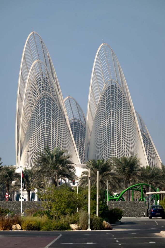 The five metal masts of the museum, shaped after the feathers of a falcon – a highly symbolic animal for Sheikh Zayed – and stretching up to 123 meters, are the main elements of the building, which can be seen from far. The towers also serve as thermal chimneys which absorb cool air from underground and ventilate the building naturally. Their shapes and orientations are such that they do not overshadow each other, thus a lot of natural light comes to the inside of the building.